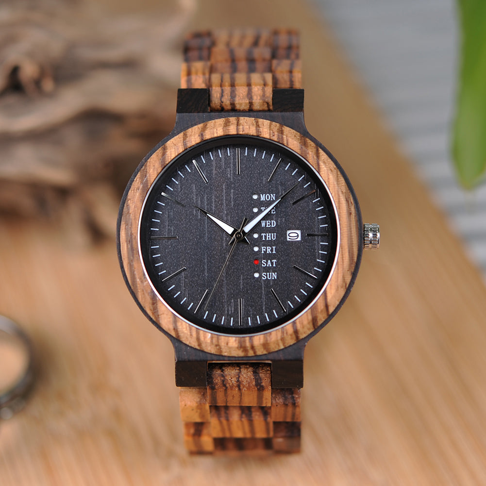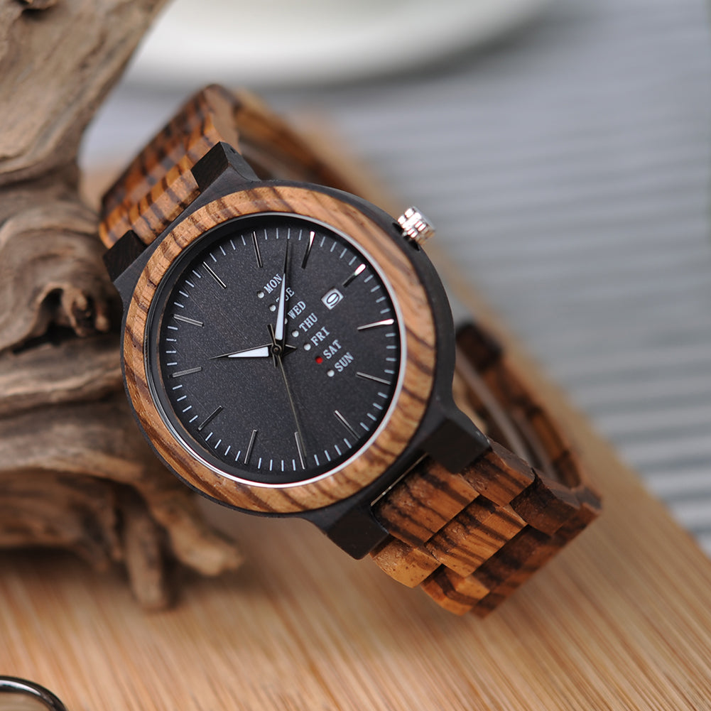 A wood watch is perfect for the discerning individual who values one-of-a-kind pieces. Stay stylish and on schedule with this handcrafted wood watch. Featuring an adjustable wooden band that showcases its beautiful natural wood grain. The watch also includes a handmade bamboo cylinder for a unique touch.