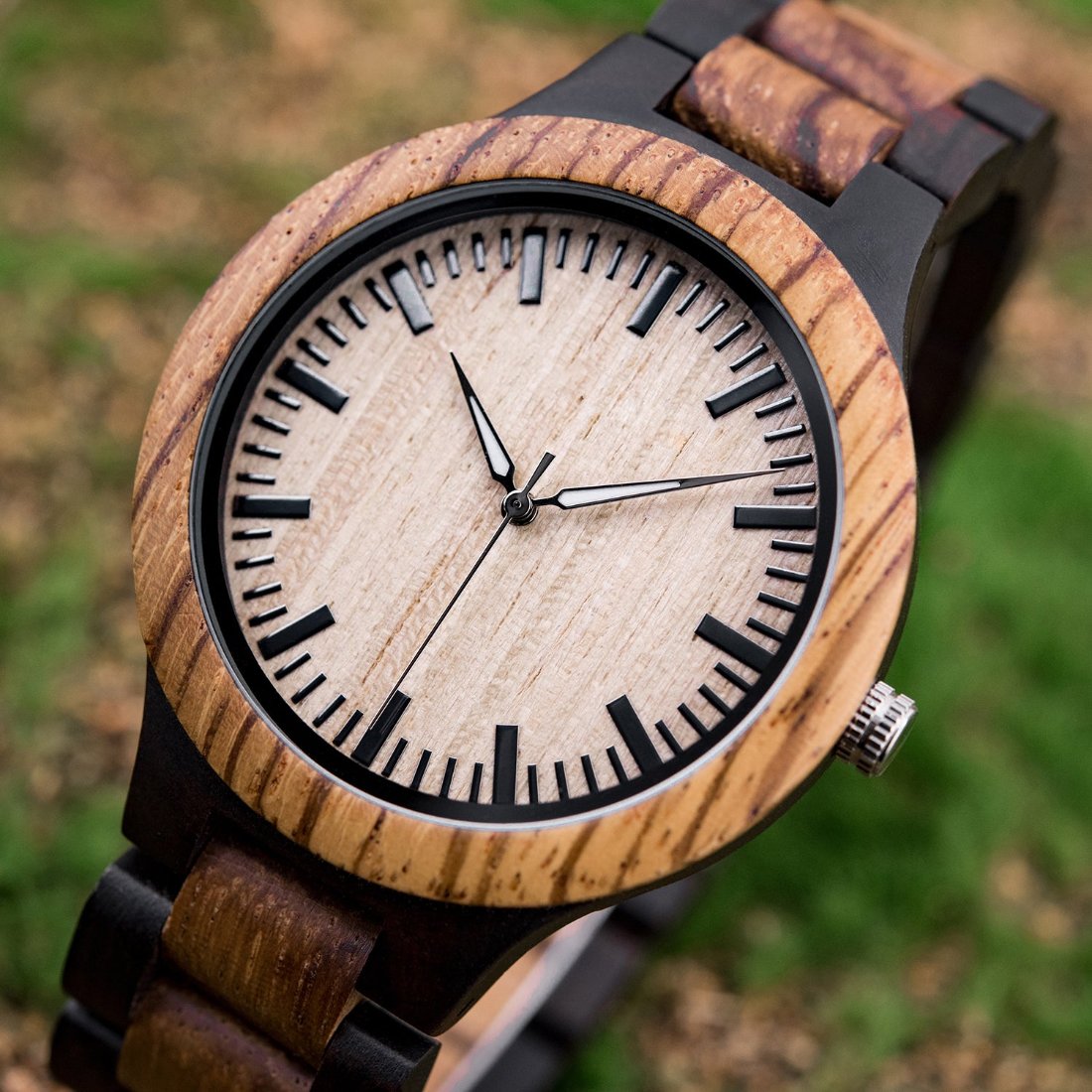 A wood watch is for the discerning individual who values one-of-a-kind pieces. Stay stylish with this rugged and natural two-tone wood watch design. Featuring an adjustable wooden band that highlights its beautiful natural wood grain, the Two Tone also includes a handmade bamboo cylinder for a unique touch.