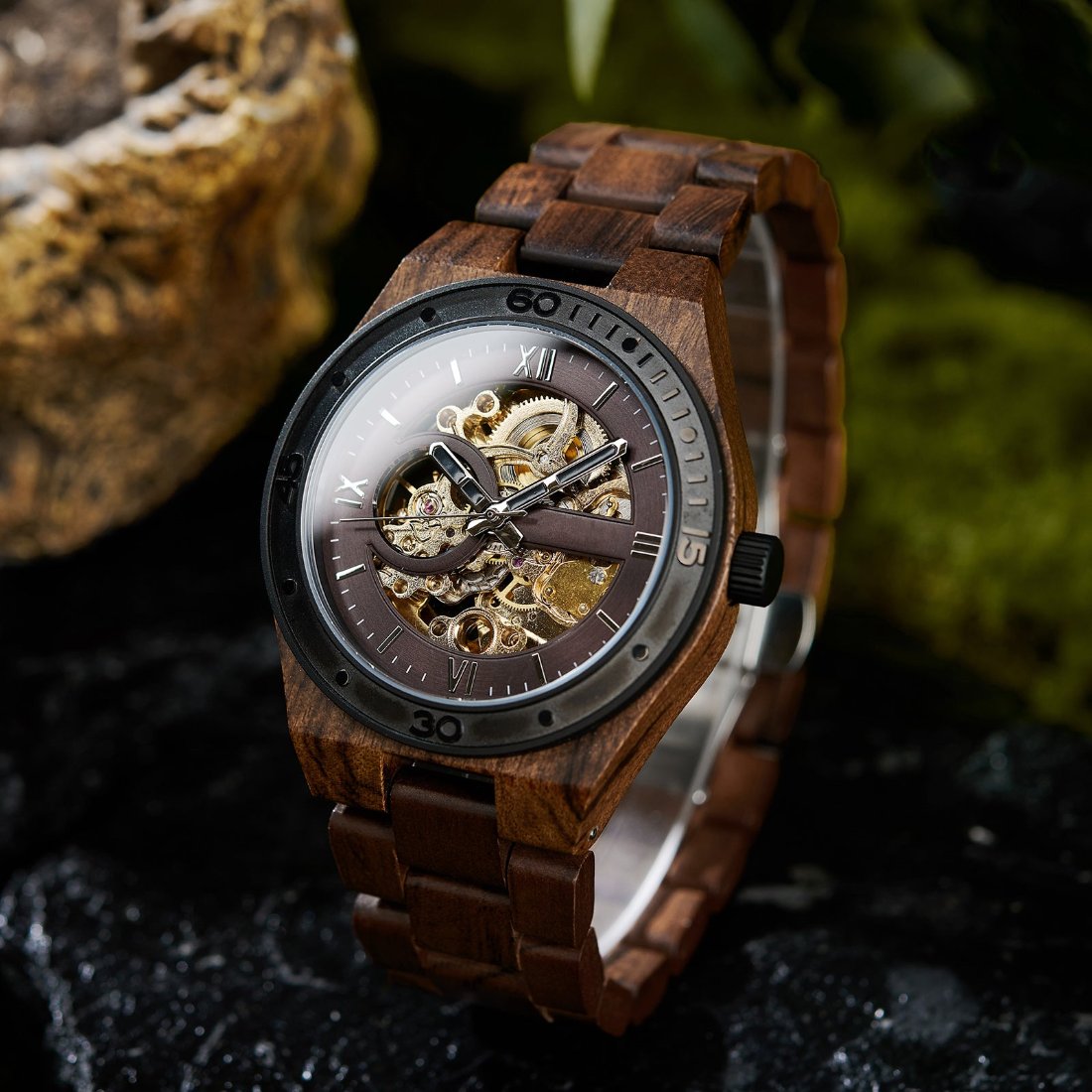 Un reloj de madera es ideal para la persona perspicaz que aprecia piezas únicas. Esta actualización moderna del steampunk clásico seguramente será un tema de conversación cada vez que lo uses. Tiene una banda de madera ajustable que muestra su grano de madera bellamente natural. El Mecánico tiene un movimiento japonés  automático, por lo que no necesita batería. También viene con un cilindro de bambú hecho a mano.