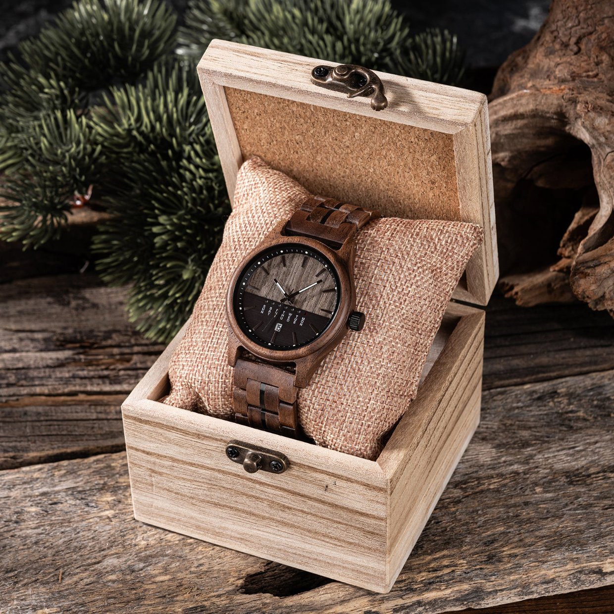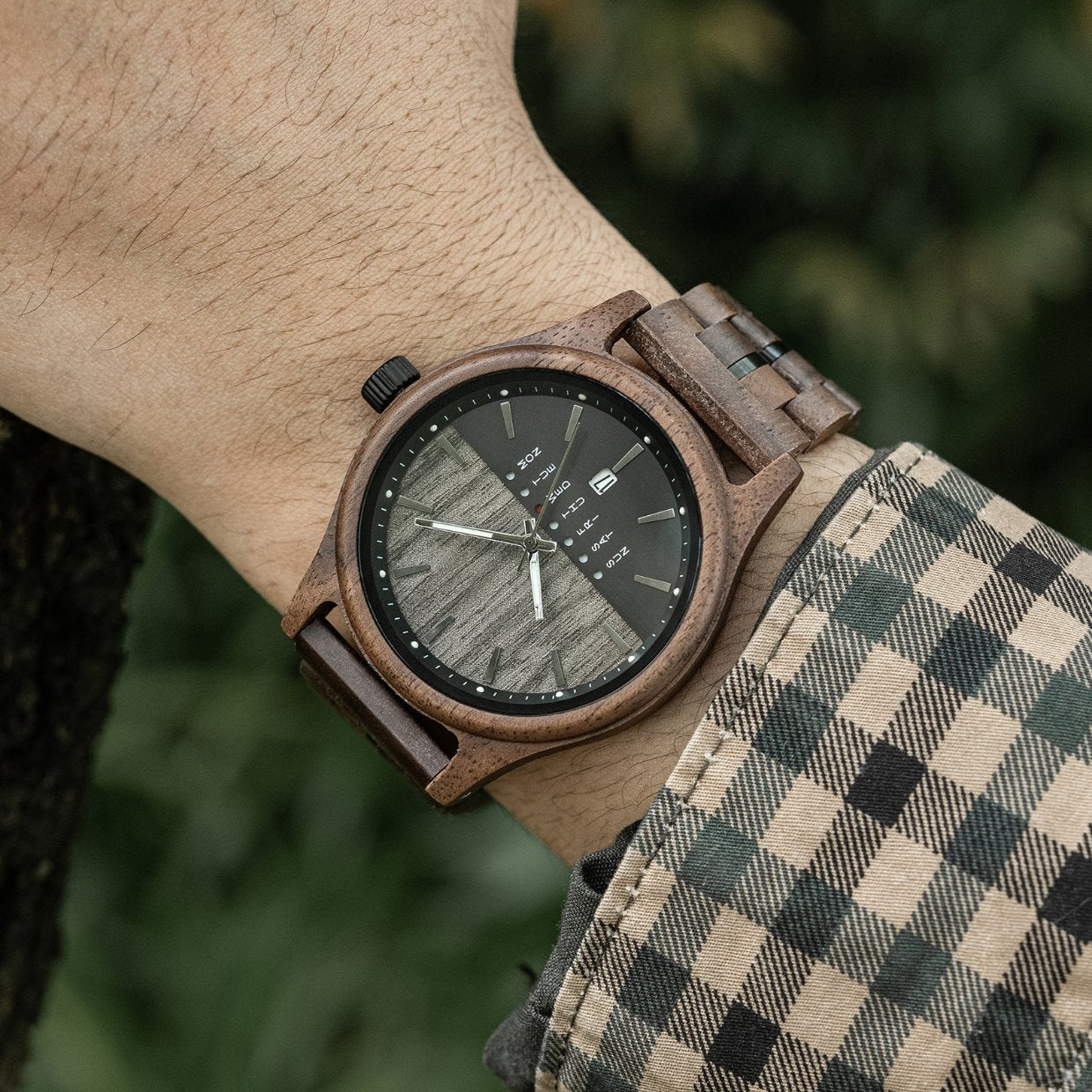 Un reloj de madera es ideal para la persona perspicaz que aprecia piezas únicas. Luzca con estilo mientras se mantiene al tanto de sus días con este reloj de madera único y artesanal. Tiene una banda de madera ajustable que muestra su grano de madera bellamente natural. The Parallel también viene con un cilindro de bambú hecho a mano.