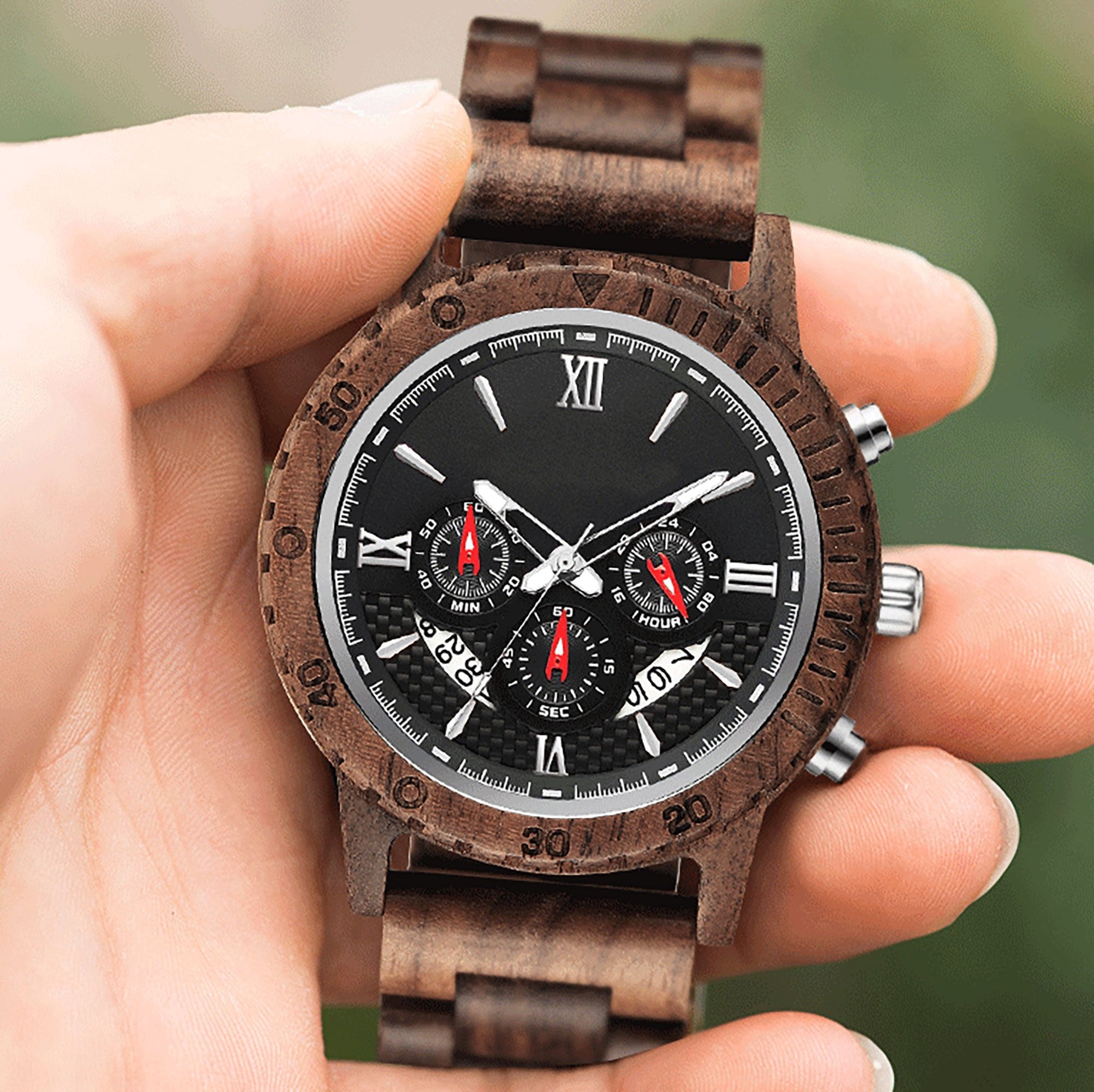 Discover the perfect personalized gift for the watch lover in your life with our wooden chronograph watch. Crafted from sustainable materials, this watch boasts chronograph functionality and a sleek wooden design that adds natural beauty to any outfit. Make it truly one-of-a-kind by personalizing it with your own message, making it a thoughtful and eco-friendly gift that will be treasured for years to come.